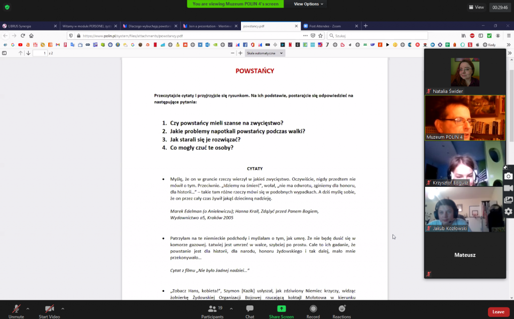 Podczas jednej z godzin wychowawczych klasa 7B „wybrała się” do Muzeum Polin. Lekcja była poświęcona powstaniu w Getcie Warszawskim. Uczniowie podjęli próbę odpowiedzi na pytania: