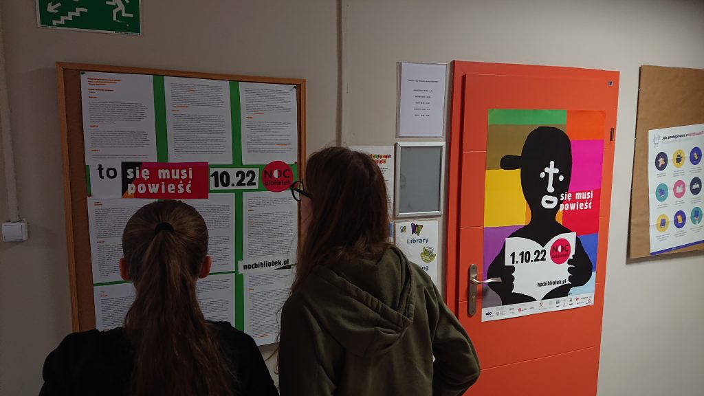 Efekty wrześniowej i październikowej pracy literackiej uczniów, można zobaczyć w postaci wydruków opowiadań na każdym piętrze na wywieszonym bristolu. Teksty powstały w ramach VIII wydania ogólnopolskiej Nocy Bibliotek pod hasłem