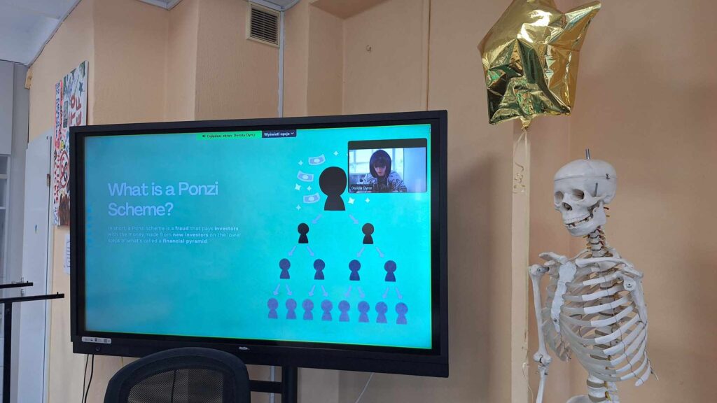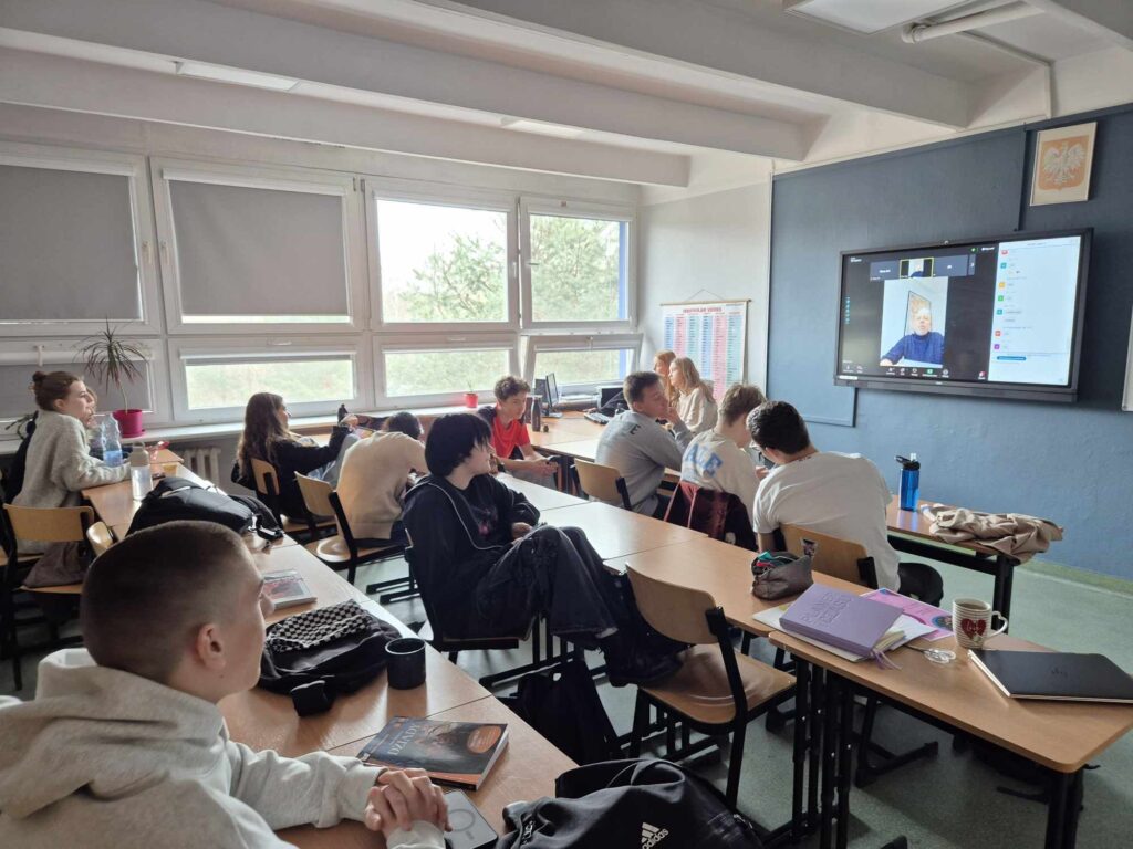 3LB ćwiczy umiejętności prowadzenia prezentacji i wykładów online. Jedna osoba przed komputerem tłumaczy zawiłości różnych tematów (np. jak działają piramidy finansowe, wulkany czy gra Brawl Stars), a pozostali uczniowie w