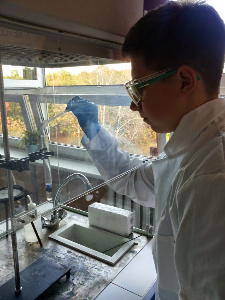 Nasi chemicy wywołali burzę w probówce. Mateusz długo obserwował błyskawice, które szalały pod wyciągiem.