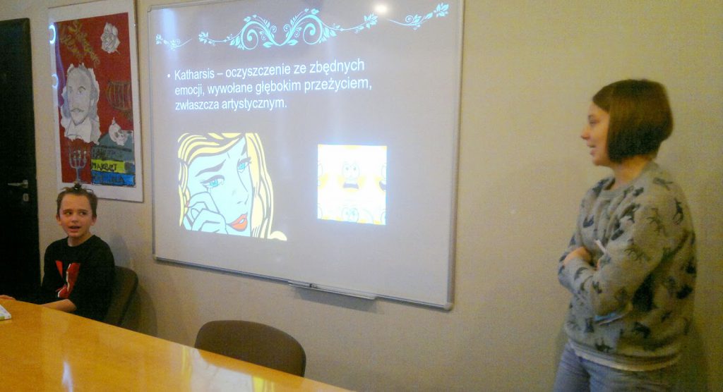 zadaniami dla słuchaczy. Jednym z poruszonych zagadnień było greckie pojęcie katharsis – opowiadaliśmy, jak mogą poruszyć nas dzieła sztuki: jedni płaczą, inni wciąż myślą o bohaterach, jeszcze innych kłuje coś w sercu…:))