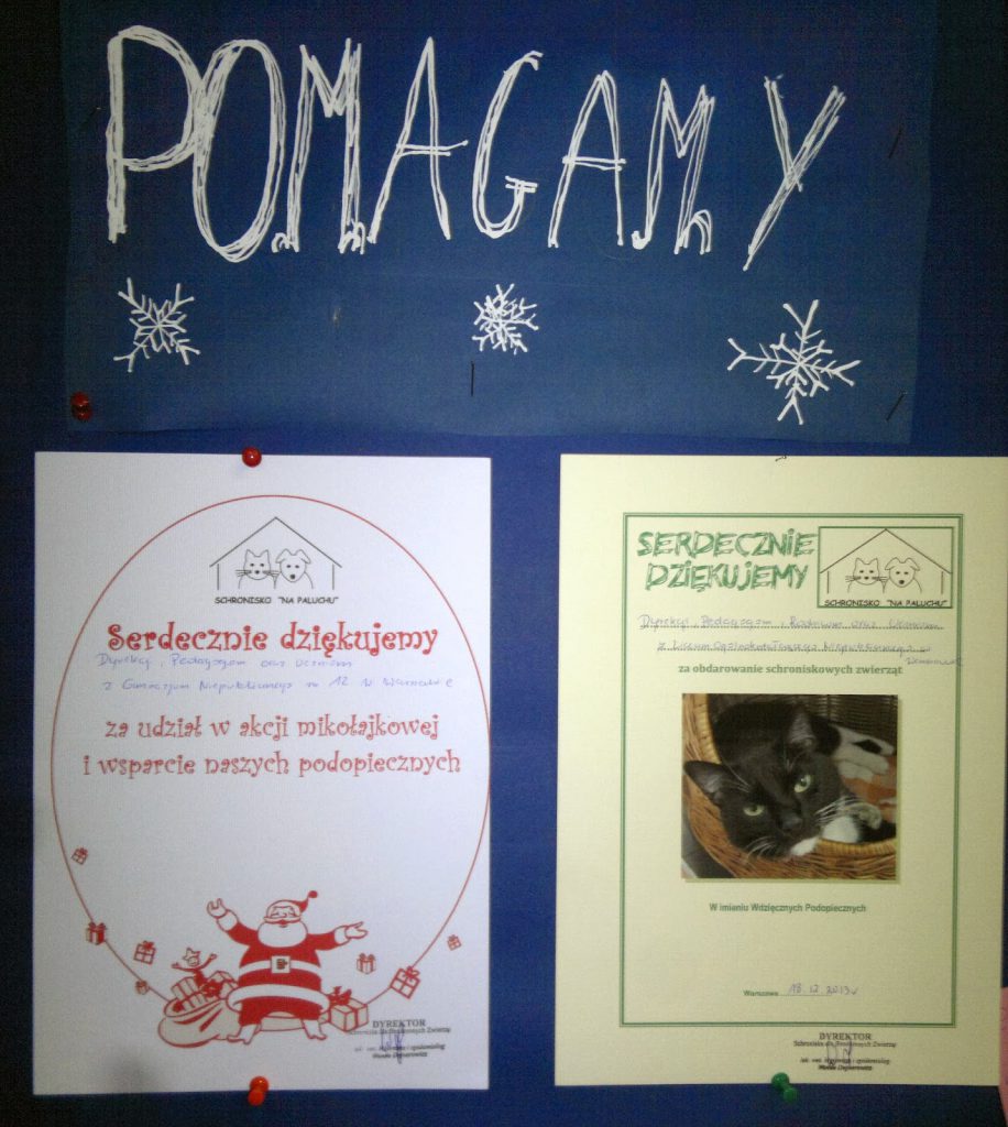 Kochani! Grudzień to wyjątkowo aktywnie spędzony przez Was miesiąc! W ostatnim poście pisaliśmy o zaangażowaniu klas pierwszych, dziś o akcji samorządu szkolnego – nie zapomnieliście o zwierzakach i dzięki Waszemu działaniu schronisko „Na Paluchu”, a przede wszystkim jego czworonożni podopieczni wzbogacili się o pokaźne kilogramy karmy i inne niezbędne akcesoria. Brawo!