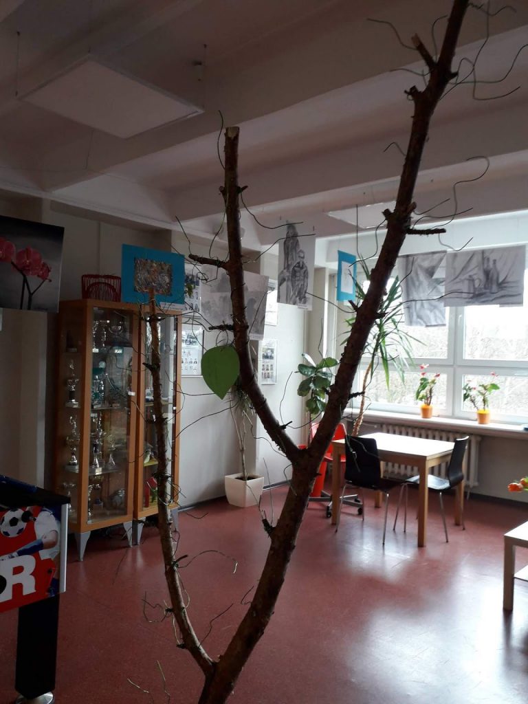 bezlistne drzewo, które stanęło na szkolnym korytarzu. Każda osoba