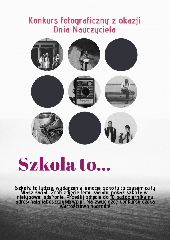 Kto ma zdolności fotograficzne..? Kto potrafi niebanalnie spojrzeć na szkołę..? A kto ma po prostu komórkę i może zrobić nią zdjęcie? Tych wszystkich zapraszamy do konkursu fotograficznego z okazji Dnia Nauczyciela! Postaraj się zrobić zdjęcie, którego tematem jest hasło „Szkoła to…” i prześlij na adres sekretariat@pspo.ed.pl lub nataliaboszczyk@wp.pl. Na ciekawe ujęcia szkoły czekamy do 10 października. Dla zwycięzcy – nagroda:))