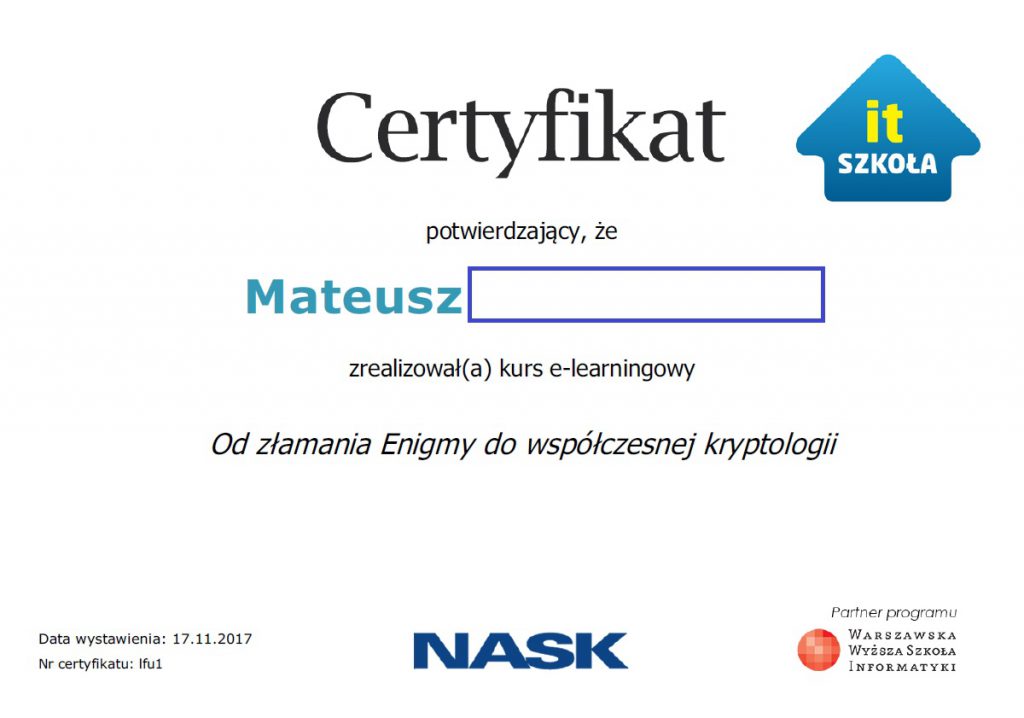 rozwiązania testu, po którym dostają imienne certyfikaty ukończenia.
