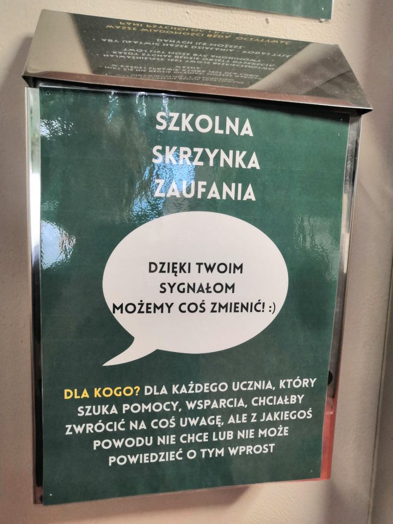 Szkolna skrzynka zaufania znajduje się na piętrze, między szklaną gablotą z dniami miesiąca a tablicą psychologiczno – pedagogiczną.