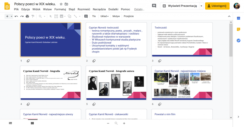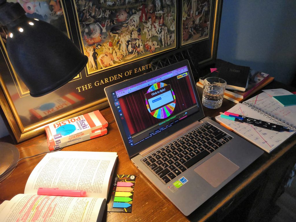 Pracujemy z wykorzystaniem różnych aplikacji; jest to przede wszystkim Google Classroom, Zoom, Quizlet, Padlet, Spiderscribe, pakiet narzędzi Googla i wiele, wiele innych… To nasze przykładowe prace: robione wspólnie prezentacje w Google Slides, mapy myśli i koła fortuny…