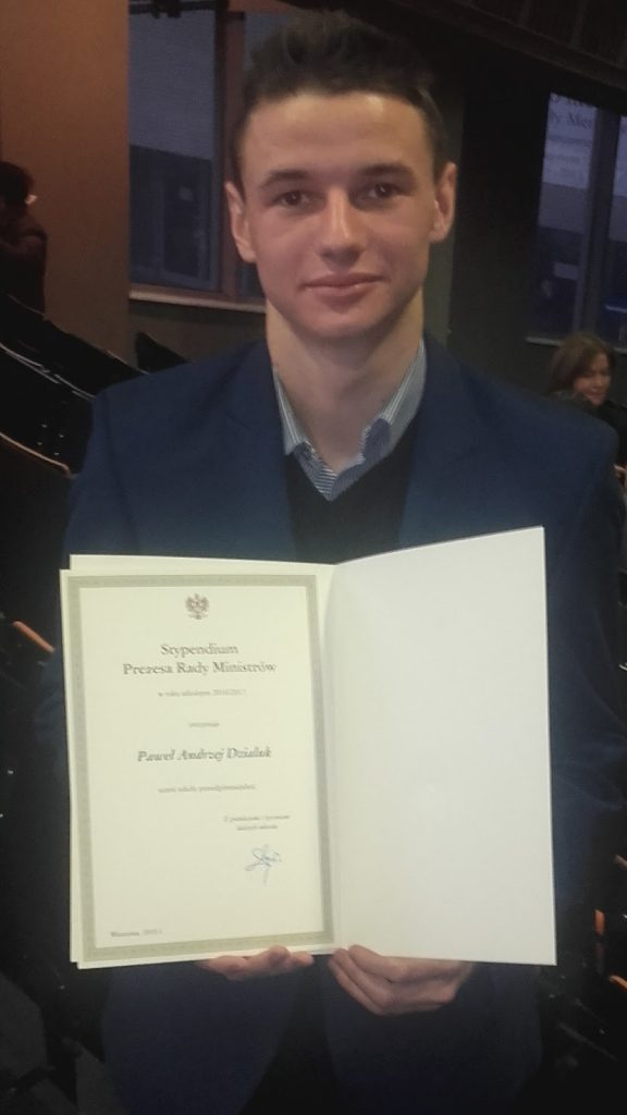 Bardzo miło jest nam przekazać ważną wiadomość: we wtorek, 15 listopada uczeń naszego liceum Paweł Dzialuk odebrał stypendium Prezesa Rady Ministrów za najlepsze w naszej szkole wyniki w nauce. Serdeczne gratulacje, Pawle!