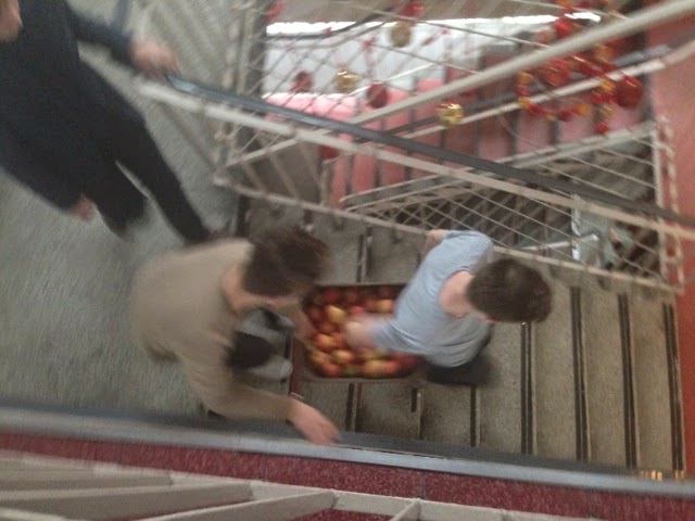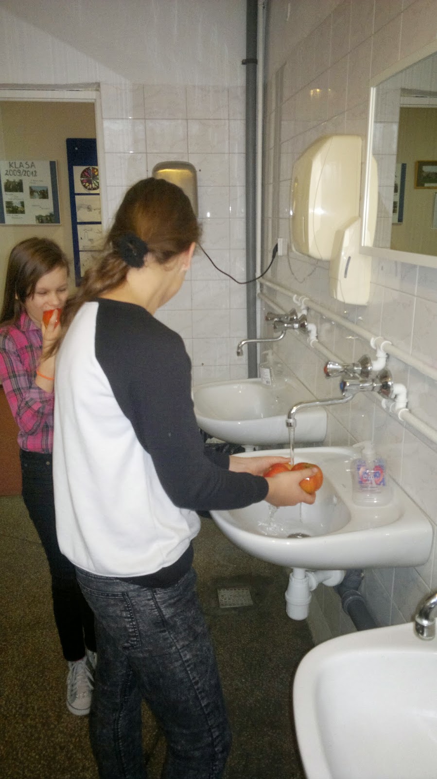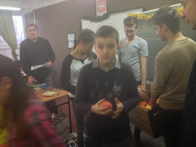 Jak wiadomo, przed świętami nasz Klub Wolontariatu ostro zaangażował się w pomoc potrzebującym zwierzętom. Dożywiać jednak trzeba i to w zdrowy sposób – nie tylko zwierzęta, ale i uczniów. Wszak nie samą nauką (choćby w najbardziej kreatywnej formie) uczeń żyje. Stąd „witaminowy strzał jabłkowy”! Trafiony w dziesiątkę – 800 kg z Agencji Rynku Rolnego, od sadownika pana Daniela Piaseckiego z Warki – pochłaniajmy jabłka:)))