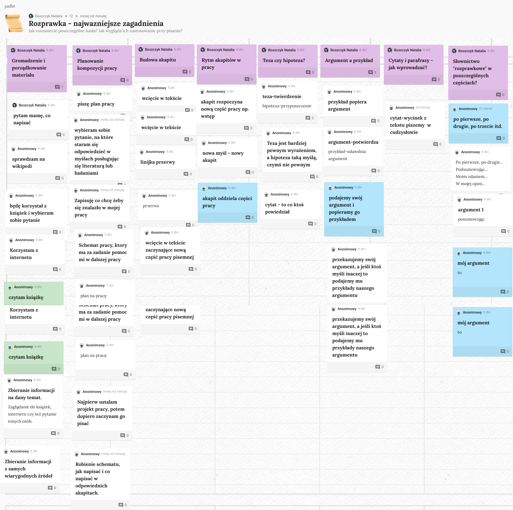 Nie tylko możemy więcej, ale też wiemy więcej. Na polskim w klasie siódmej pracujemy na wiadomościach, zdobytych przez nas w poprzednich klasach, a gdy pracujemy w grupach okazuje się, że tych wiadomości jest całkiem sporo – oto, co w ciągu 20 minut pracy z Padletem udało się stworzyć na temat rozprawki: