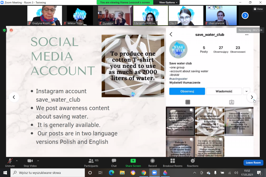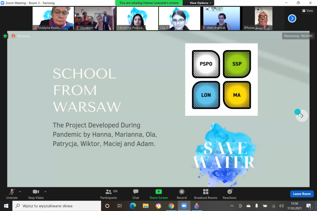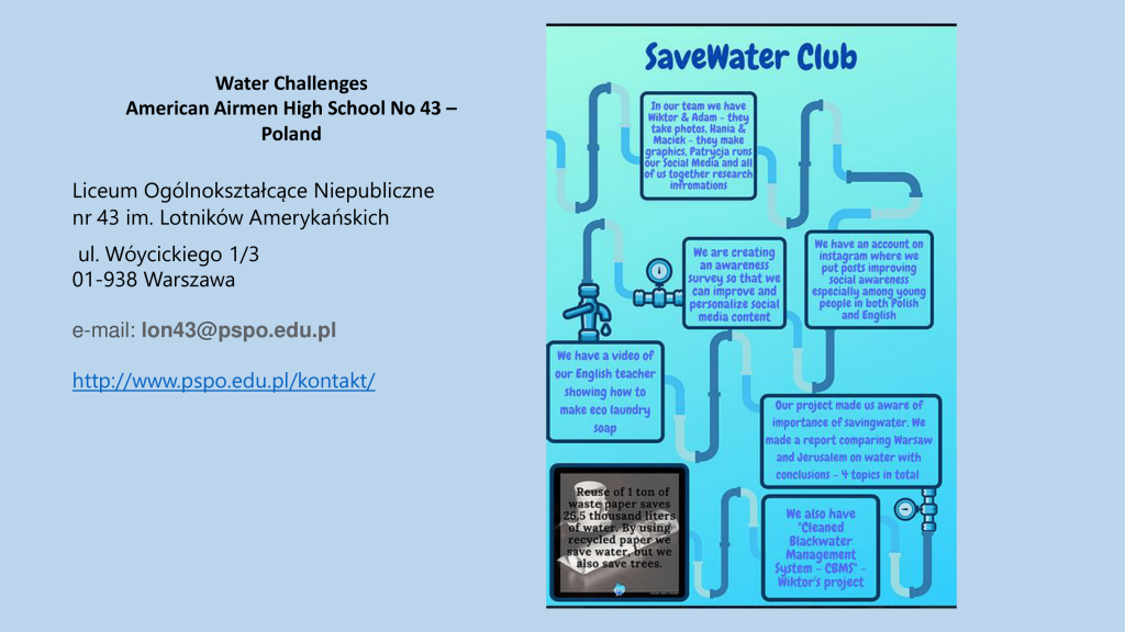 Cały projekt był prowadzony przez naszych uczniów samodzielnie z lekką pomocą p. Grażyny Kozińskiej i p. Doroty Wasielkiewicz. Powstał klub Save Water z pięknym logo i z kontem na instagramie. Dodatkowo Wiktor zaprojektował system oczyszczania „czarnej wody” czyli ścieków z ubikacji i wykonał do tego model.