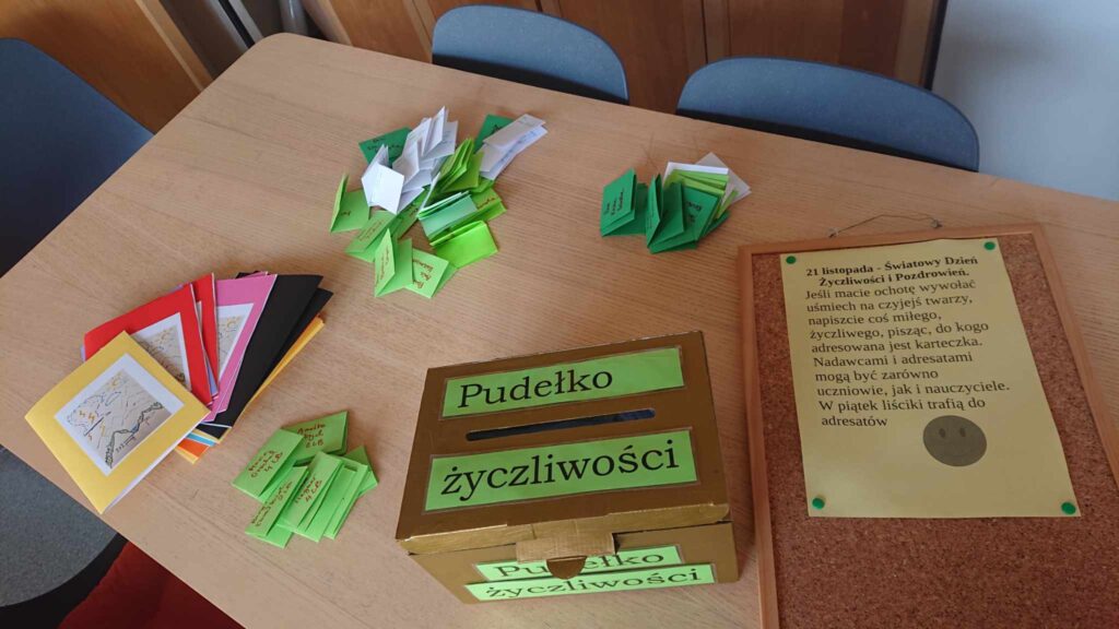 Jak co roku, w listopadowym Tygodniu Życzliwości, społeczność szkolna, uczniowie, nauczyciele, pracownicy, mogli napisać dla siebie nawzajem coś miłego i wrzucić do pudełka życzliwości. Na koniec karteczki zostały doręczone do adresatów przez p. Natalię z biblioteki, wywołując uśmiechy na twarzach ![]()