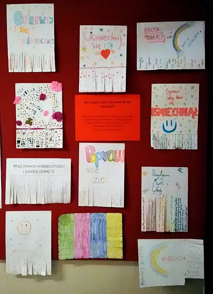 W naszej szkole wszyscy dbamy o nasze dobre samopoczucie – zarówno podczas lekcji, jak i na przerwach. Właśnie dlatego uczymy się współpracować; zastanawiamy się też, czym jest empatia i staramy się aktywnie tworzyć przyjazny klimat w szkole. Uczniowie klasy 2A po rozmowie na temat lektury „Gwiazd naszych wina” i interpretacji teledysku do utworu „Beksa” Artura Rojka zgodnie stwierdzili, że przyjaźń to wielka i piękna rzecz. Efektem ich pracy są takie „pozytywne wydzieranki” – każdy może podejść, urwać karteczkę i polepszyć sobie humor na cały dzień albo podarować uśmiech drugiej osobie.
