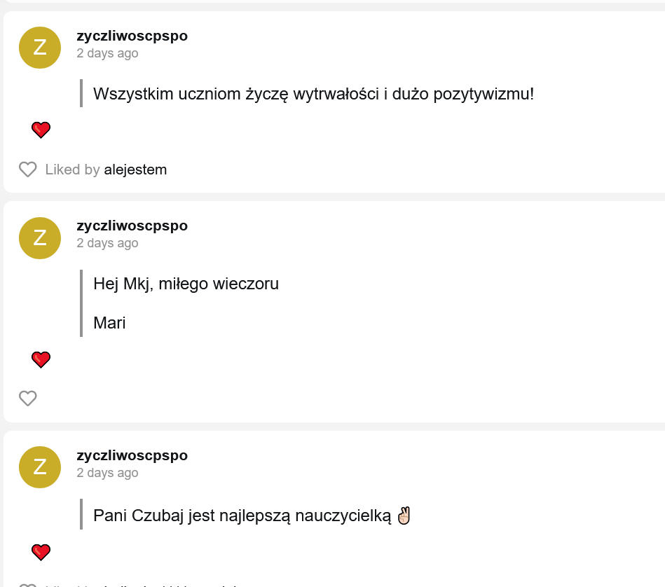 Czy widzieliście już jakie życzliwe słowa padły na naszym szkolnym Tellonym? W końcu trwa Tydzień Życzliwości – cały czas możecie przesyłać anonimowo ciepłe słowa dla osób z naszej szkolnej społeczności. Dziś też pojawiło się pierwsze wyzwanie w #kindnesschallenge: UŚMIECHNIJ SIĘ SERDECZNIE DO 5 OSÓB.