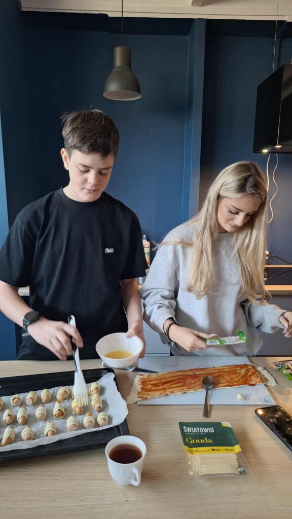1LA miała lekcje gotowania potraw angielskich. Wszyscy bardzo się zaangażowali i jedzenie wyszło pyszne! Korzyści z takich lekcji: super integracja, nauka języka od strony kultury kulinarnej kraju, ale też nauka sprawczości i super odpoczynek dla mózgu!